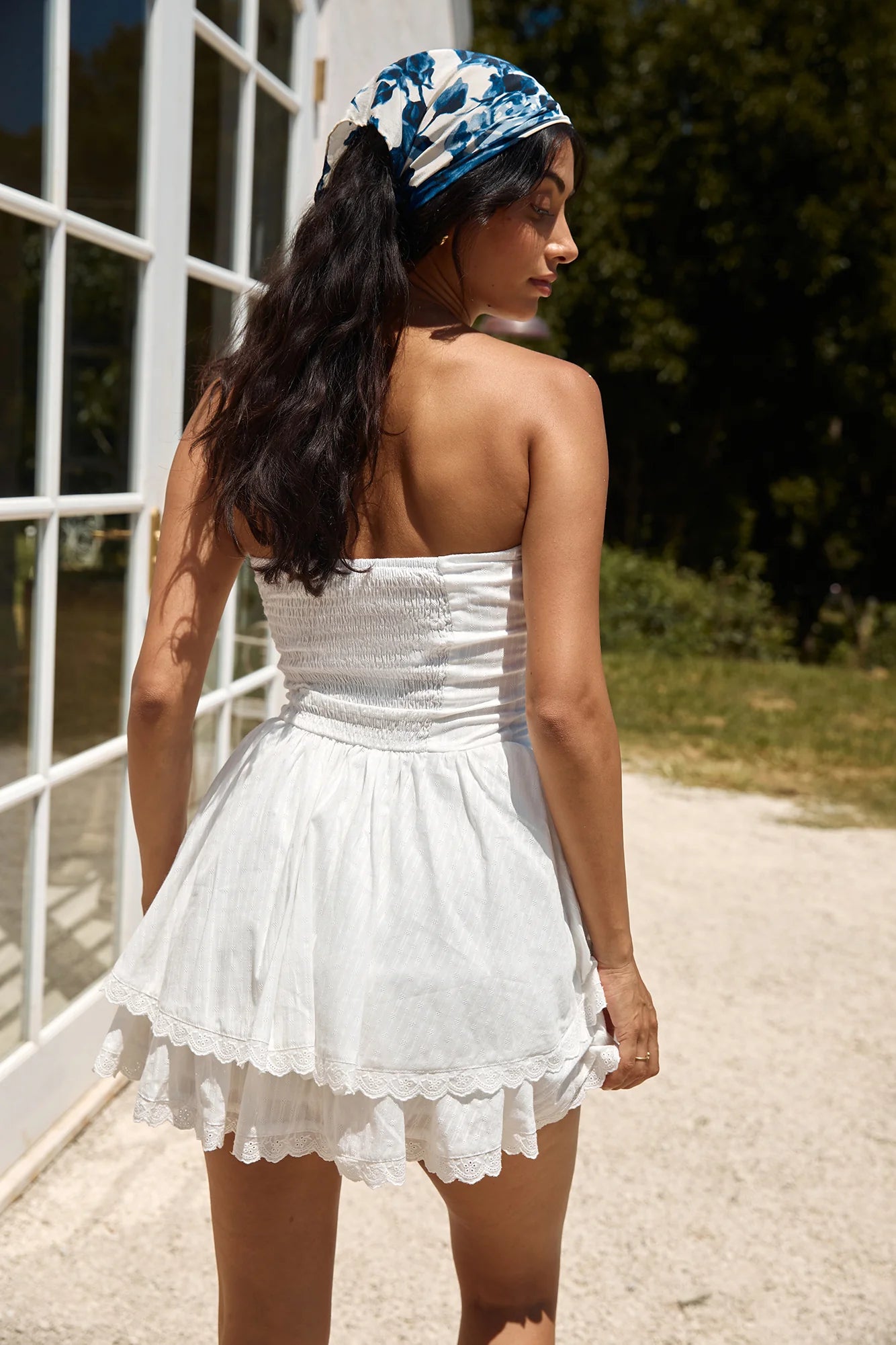 Introducing the Country Darling Strapless Mini Dress in White, a charming and romantic addition to your wardrobe, perfect for embracing carefree elegance.